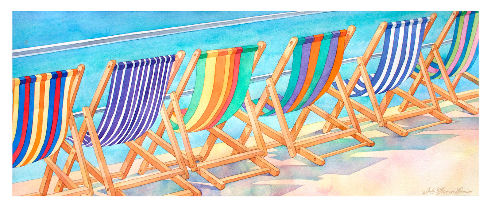 Watercolor of beach chairs lined up in, believe it or not, England ( Lyme Regis). Beautiful, sunny day!!!