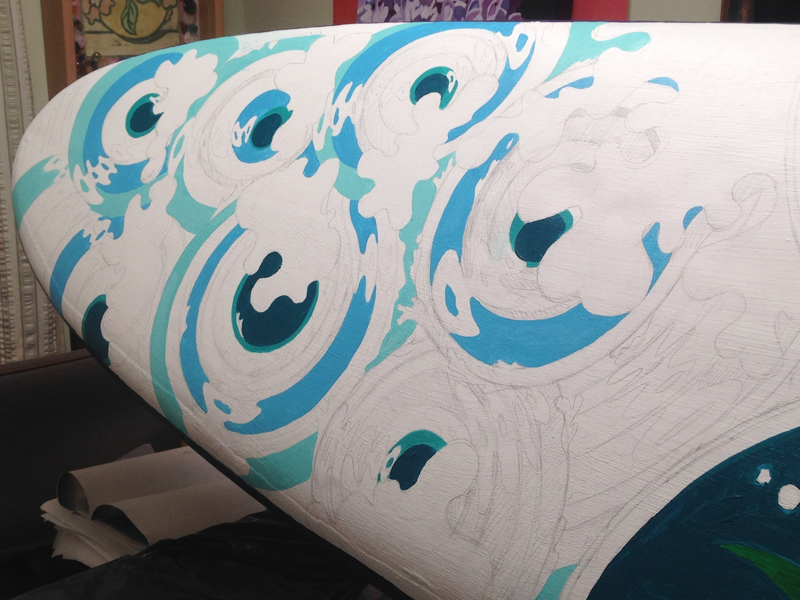 Surfboard painting for a competition, surfboard art festival and auction. Portion of the proceeds go to two charities.